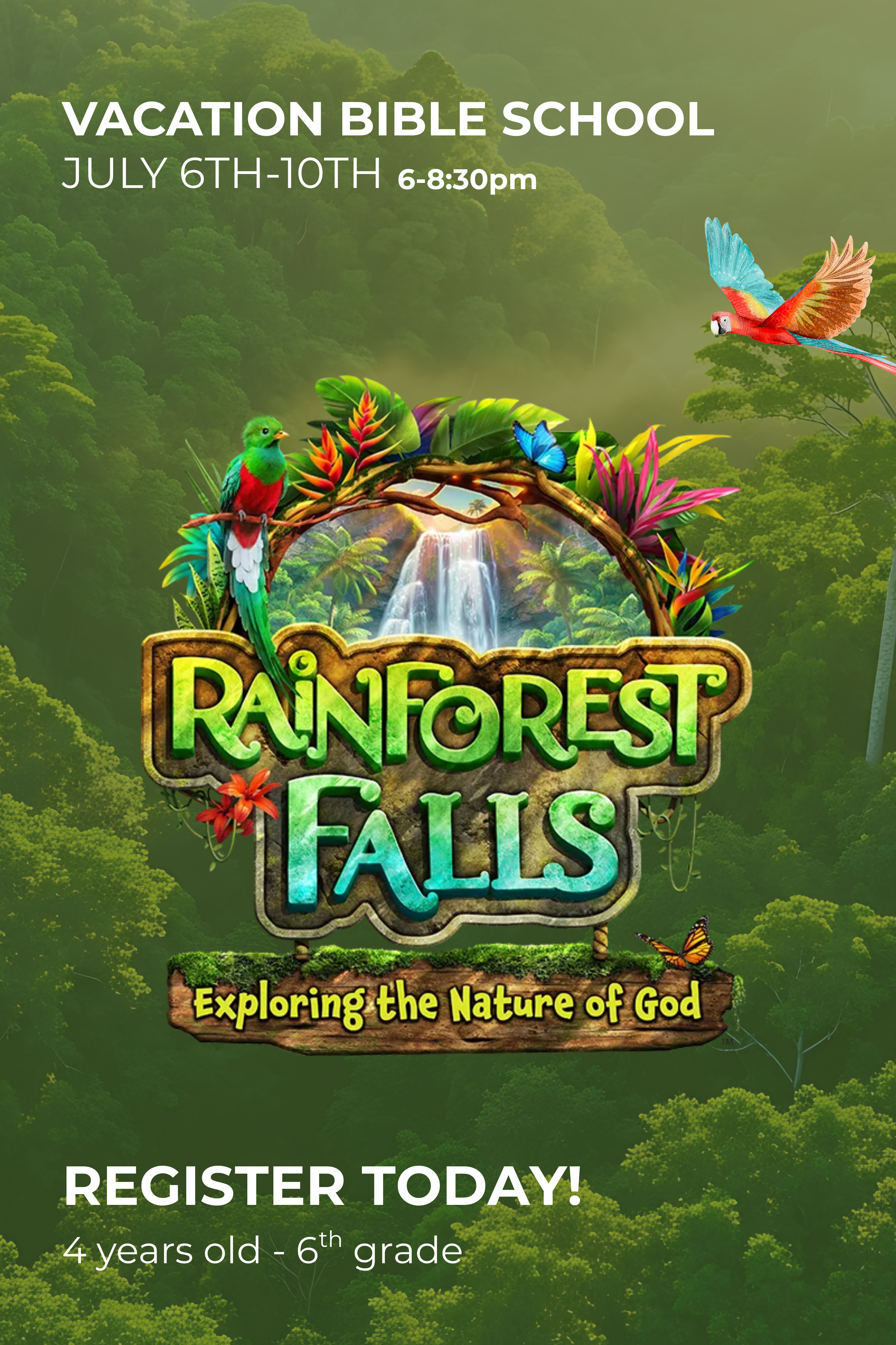Join us for Rainforest Falls VBS July 6th-10th from 6:00-8:30pm. Ages 4-6th grade is welcomed to come brave the Rainforest learning about Jesus every step of the way.